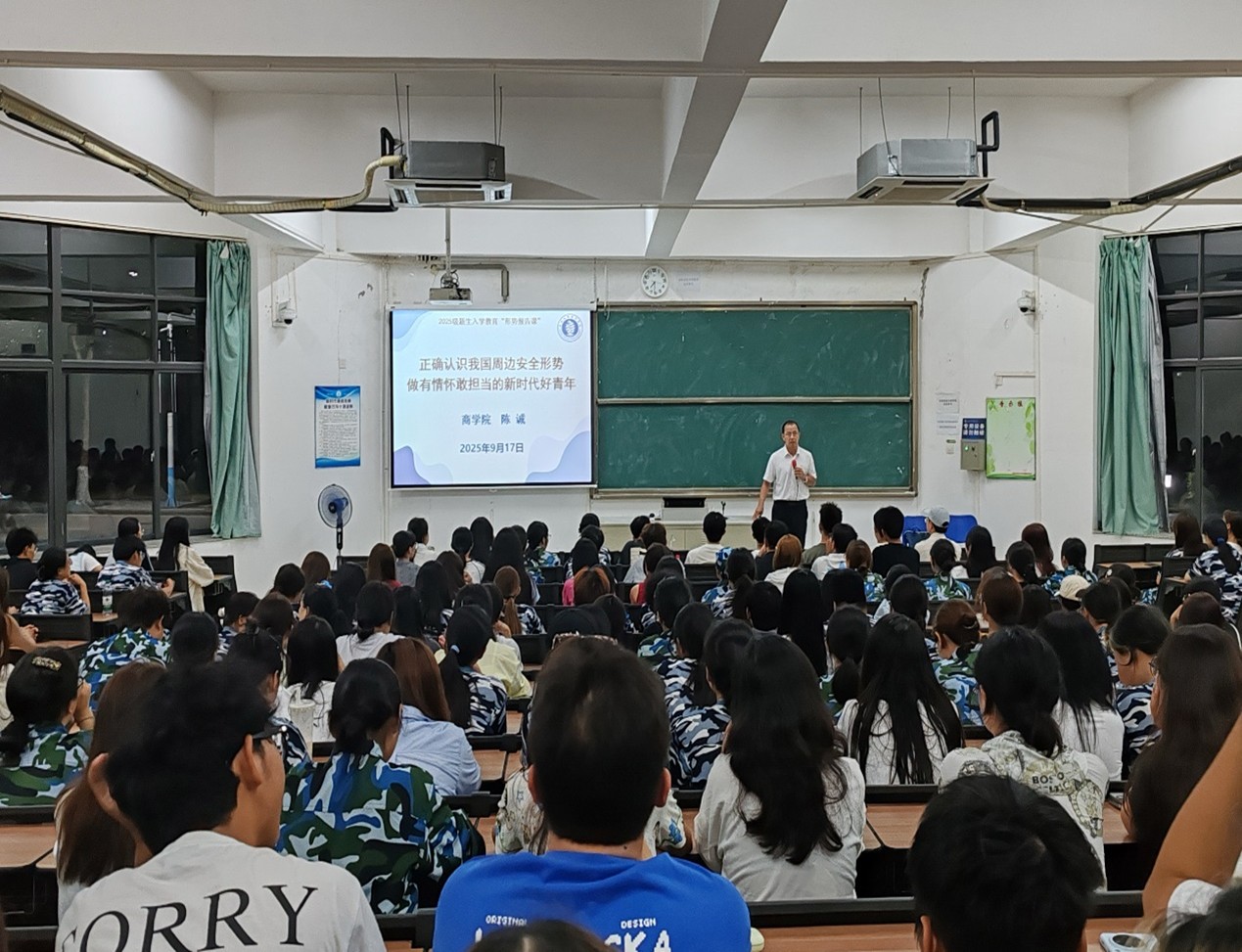 9月17日晚,商公司党委书记陈诚在三亚校区3106教室以“正确认识我国周边安全形势,做有情怀敢担当的新时代好青年”为主题,为2025级新生讲授“开学第一课”。beats3652025级全体新生到场聆听。